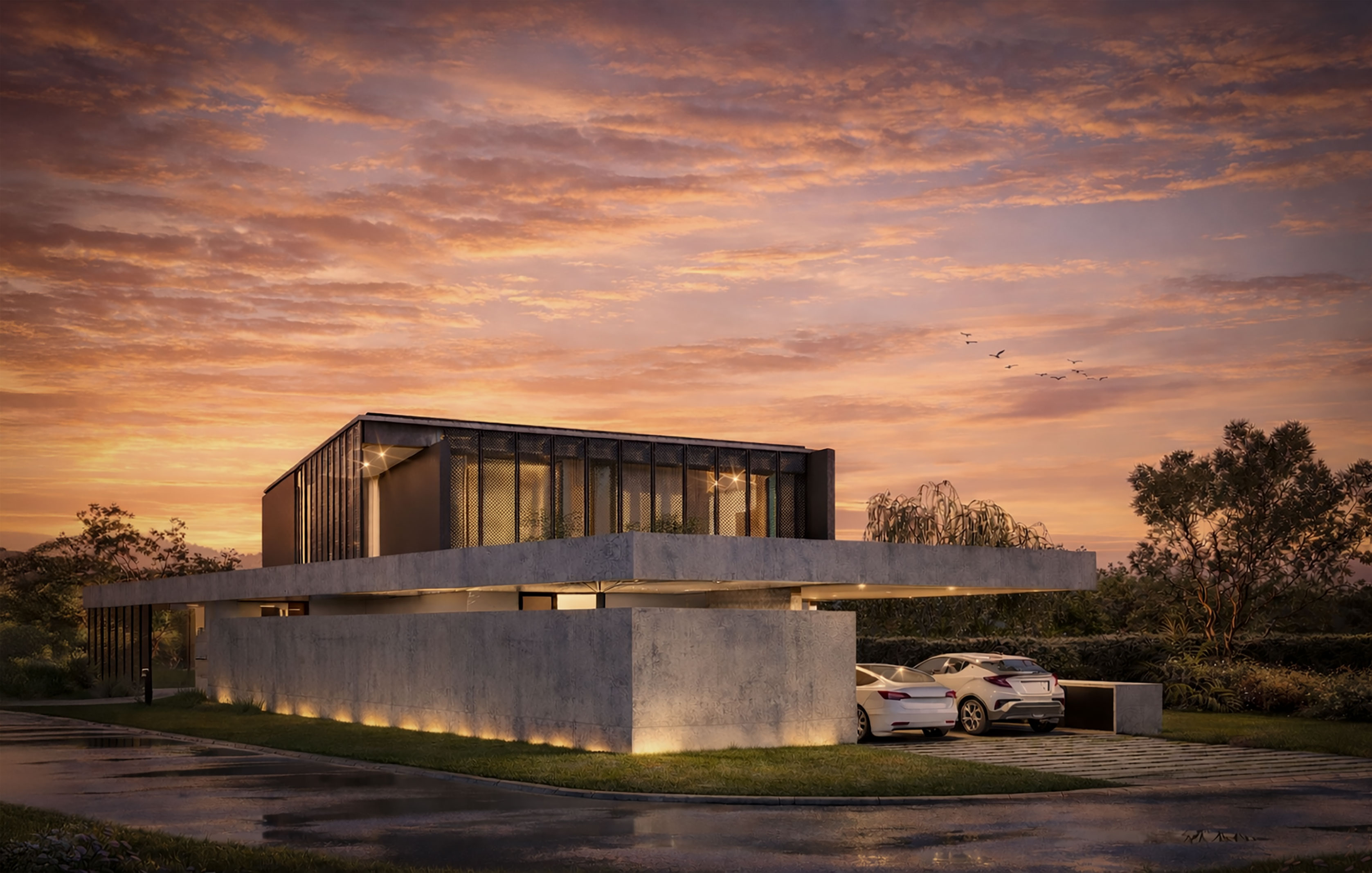 Casa CRG es una obra que busca expresar carácter desde la sobriedad, donde cada decisión proyectual responde tanto a lo funcional como a lo sensible. Una arquitectura que se afirma en su materialidad, se integra al entorno y propone una manera de habitar en contacto permanente con el paisaje. Se presenta como una composición de volúmenes horizontales y contundentes que se apoyan sobre el terreno con serenidad, cerrándose a la calle, pero generando espacios verdes que dialogan constantemente con el interior.